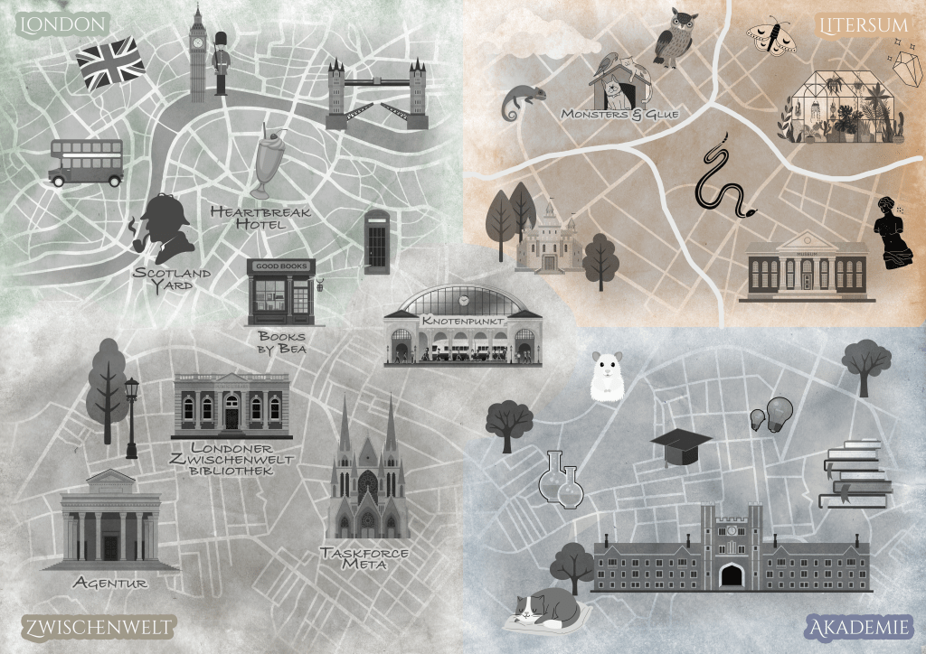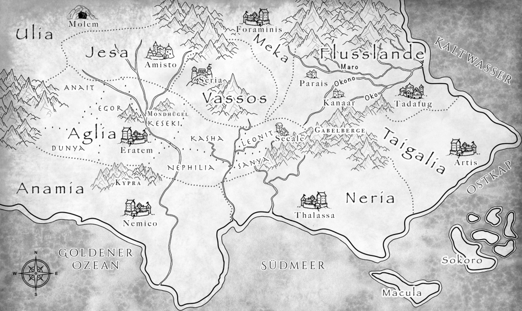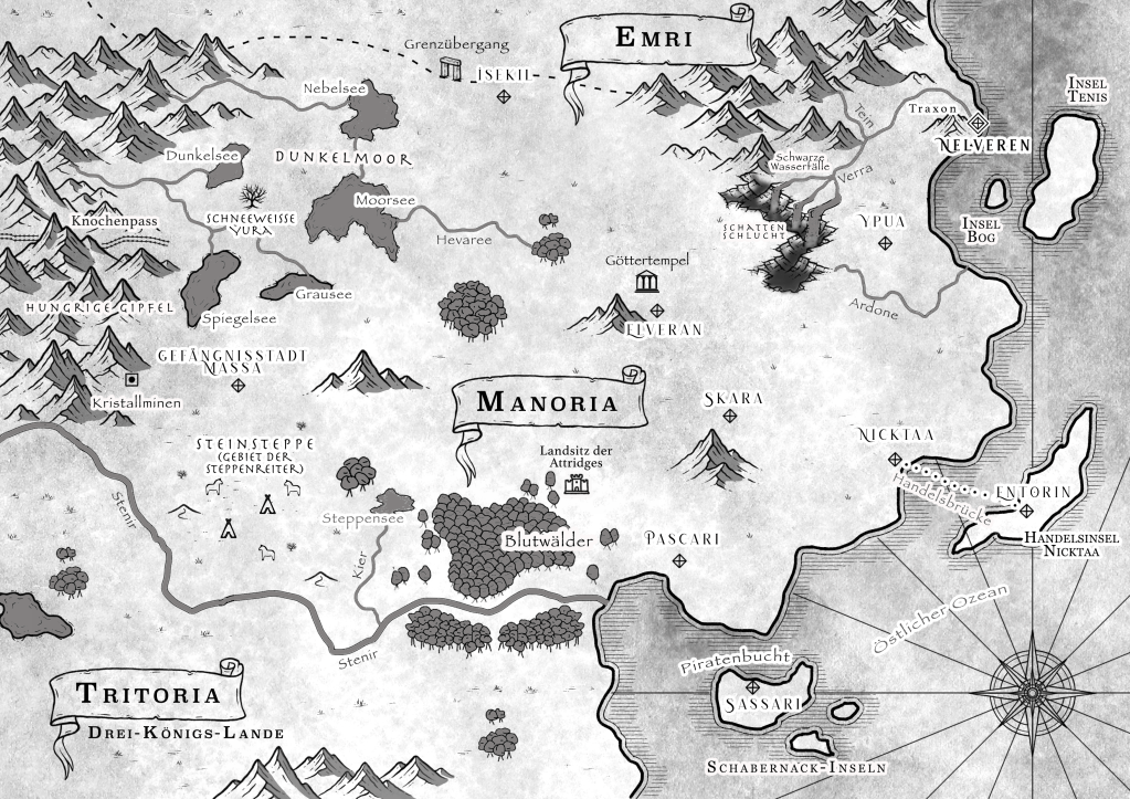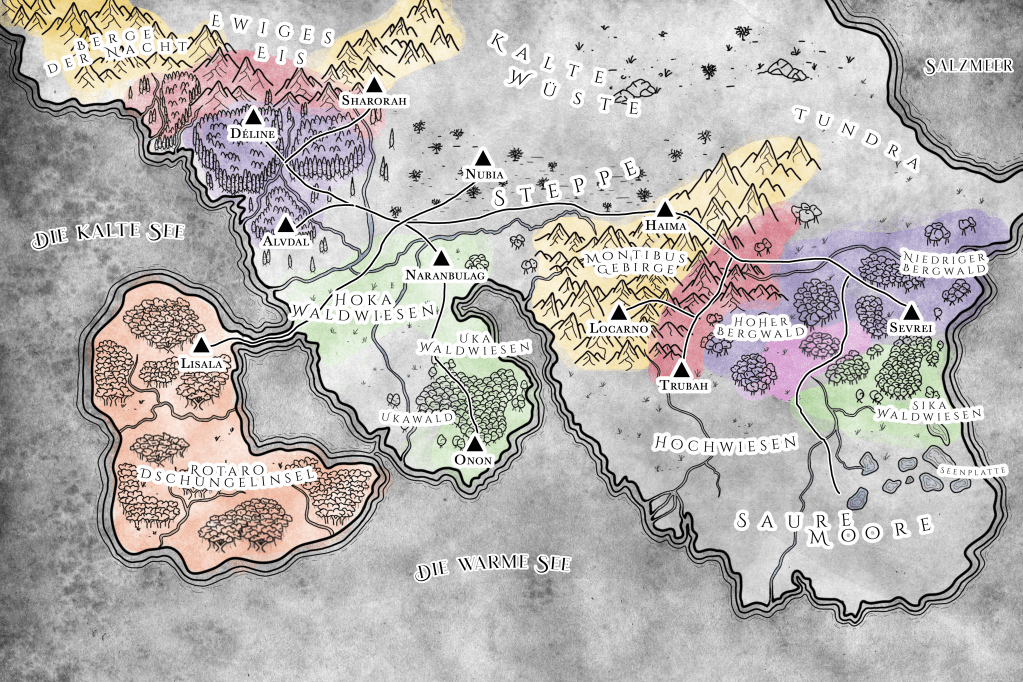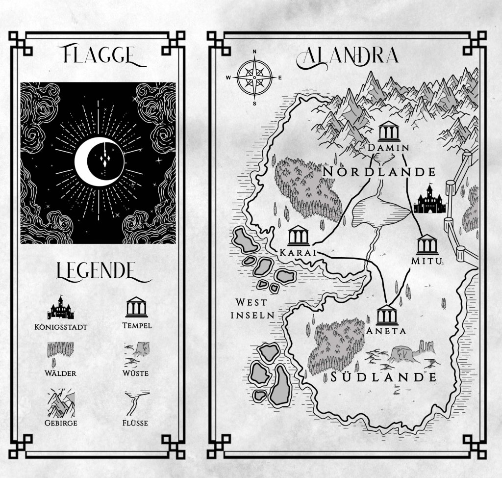 Doch wäre es nicht toll, wenn wir diese Welten auch auf Papier bestaunen könnten? Man kann Bücher auf ganz verschiedene Arten zu etwas Besonderem machen, zu etwas Außergewöhnlichem und Einzigartigem. Farbige Buchschnitte, Charakterillustrationen, Goldfolie, all das kommt bei der Gestaltung von Büchern zum Einsatz. So auch die Verwendung von Landkarten. Hier komme ich ins Spiel. Seit letztem Jahr habe ich das Zeichnen solcher Karten für mich entdeckt und arbeite mit Selfpublishern und Verlagen zusammen, um einem Buch mittels einer selbstgestalteten Karte Leben einzuhauchen. Du träumst auch von deiner eigenen Buchkarte? Dann melde dich bei mir!